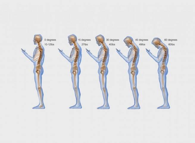 Als uw hoofd recht boven uw romp staat, oefent het een kracht uit van ongeveer een bowlingbal van 5 kilo (probeer de volgende keer bal nummer 11). De nek is hierop berekend en u kent waarschijnlijk allemaal de beelden van mensen in andere landen die veel op hun hoofd kunnen dragen. Uiteraard is hiervoor een correcte houding noodzakelijk. Als u uw nek naar voren uitsteekt en uw hoofd naar voren kantelt om op uw smartphone te kijken, neemt de kracht die uw hoofd op uw nek uitoefent al toe tot meer dan 12 kilo bij een hoek van slechts 15 graden, tot een extreme belasting vergelijkbaar met 27 kilo bij een hoek van 60 graden! Wat overigens helemaal geen ongebruikelijke hoek is, kijk maar om u heen. In onderstaand plaatje kunt u zien welke kracht het hoofd uitoefent onder welke hoek.