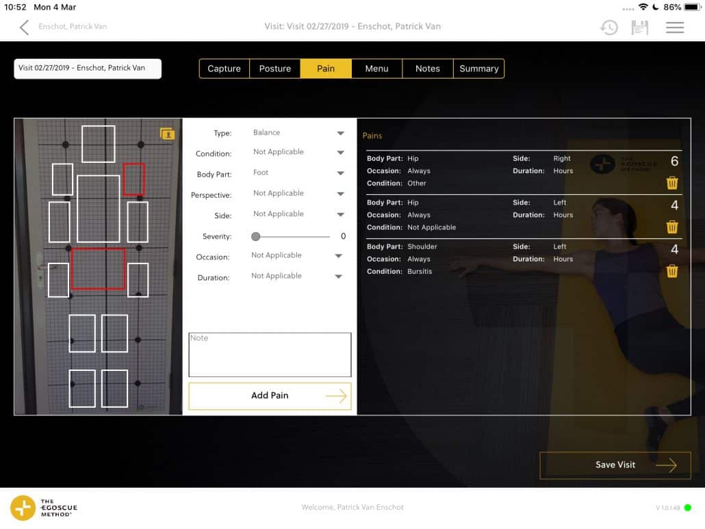 Om jouw klachten, foto’s en houding vast te leggen maak ik gebruik van de houdingstherapiesoftware “ePete” die specifiek is ontwikkeld voor het gebruik door houdingstherapeuten en voor gebruik in de Egoscue-klinieken. De software is gebaseerd op de inzichten van Pete Egoscue (vandaar de naam) en is in februari 2019 volledig vernieuwd. In onderstaande schermvoorbeelden zie je hoe dat er uit ziet (klik voor vergroting):