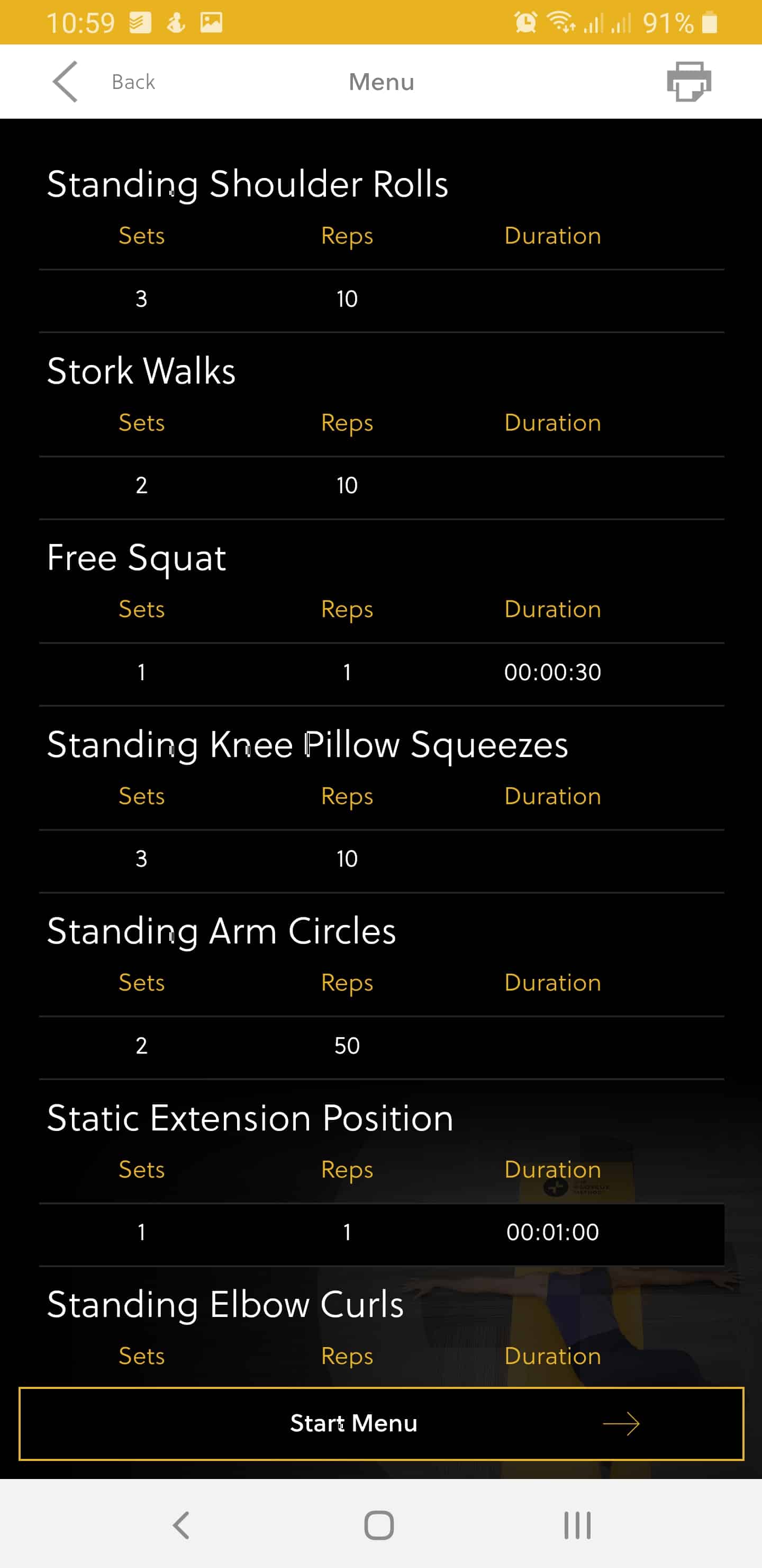 Je zult gedurende het therapieproces meerdere menu’s krijgen. Via de app kan je altijd kiezen welk menu je wil gebruiken. Het meest recente menu staat bovenaan. Als je een menu opent, zie je de oefeningen in dat menu: