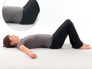 Maak een zo hol mogelijke onderrug door je bekken naar voren te kantelen (van je af) en zo een extra holling te creëren. De rest van je bovenlichaam blijft ontspannen liggen. Zie foto.