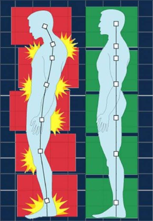 Als deze spiergroepen met elkaar in evenwicht zijn leidt dat tot een uitgelijnde houding zoals op het rechter (groene) plaatje. Je ziet hier dat alle gewrichten verticaal zijn uitgelijnd en dat er een lijn loopt van de enkel, door de knie, heup, schouder en tenslotte door het oor. Zijn de spieren die verantwoordelijk zijn voor buigen en strekken niet met elkaar in evenwicht, dan zie je een afwijking van deze lijn zoals op het linker (rode) plaatje te zien is. Hierin zijn vele varianten mogelijk. Stel je voor dat je met de linker (rode) houding gaat hardlopen, en hoeveel meer risico op blessures je loopt omdat de krachten die bij de voet binnen komen, niet gelijkmatig over het lichaam worden verdeeld.