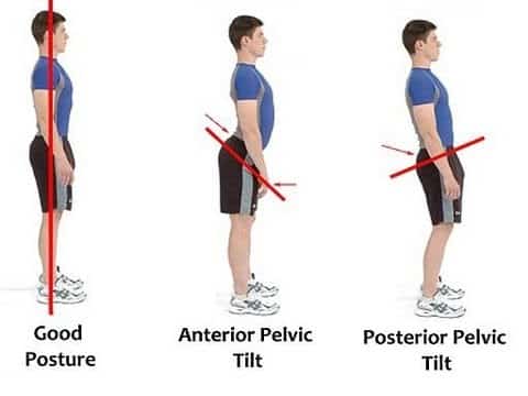 Een zeer belangrijke factor hierbij is de stand van het bekken. In het ideale geval staat het bekken neutraal en recht, zoals te zien is in het eerste plaatje (ironisch genoeg plaatjes van een man, maar ik kon geen vergelijkbare plaatjes van een vrouw vinden). Wat we echter vaak zien is een bekken dat naar voren gekanteld is (middelste plaatje) of naar achteren gekanteld is (rechter plaatje). Omdat het lichaam een eenheid is, zal dit effect hebben op de rest van het lichaam.